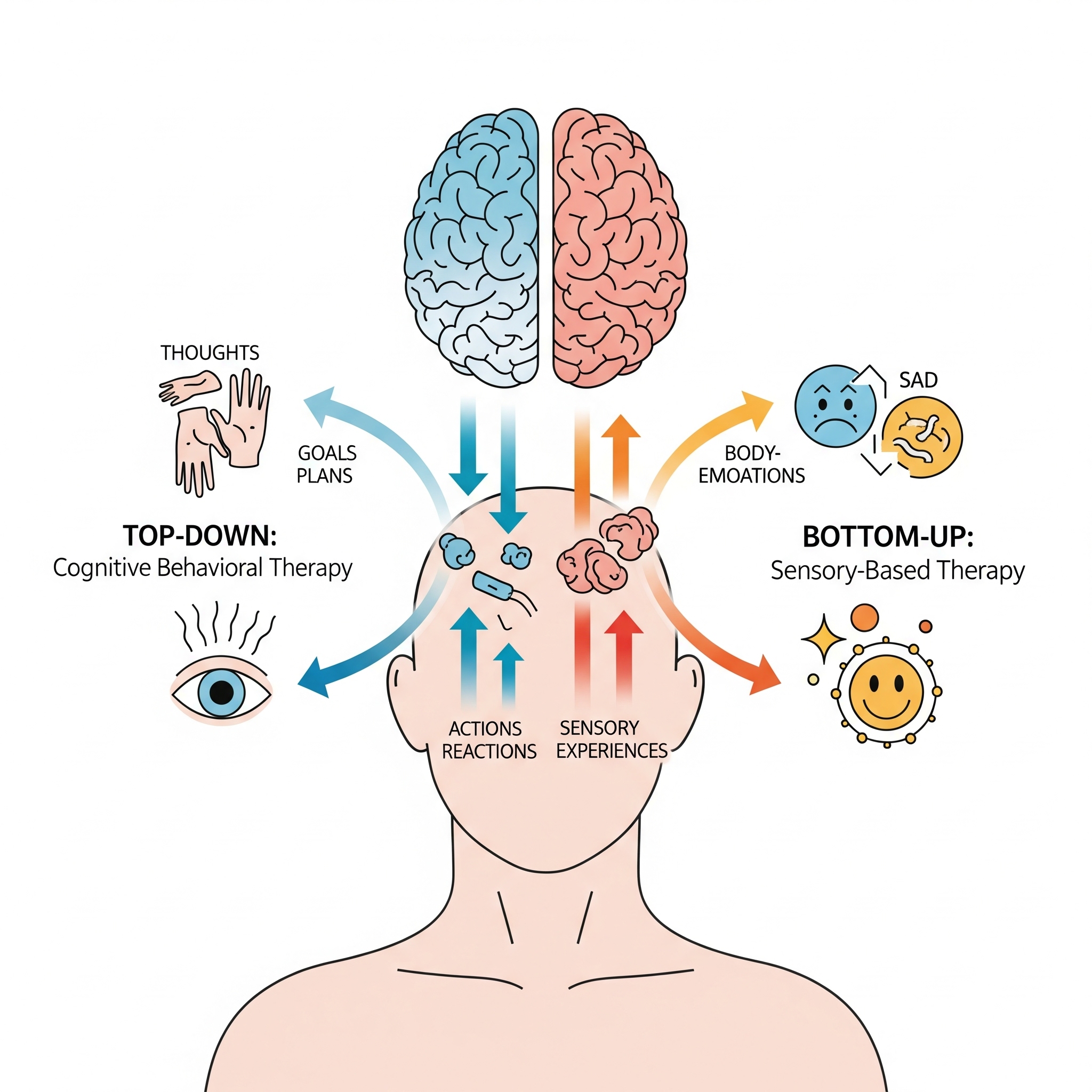 Top-down and bottom-up are two distinct approaches used in therapy to address mental health and emotional well-being. These approaches refer to how the brain processes